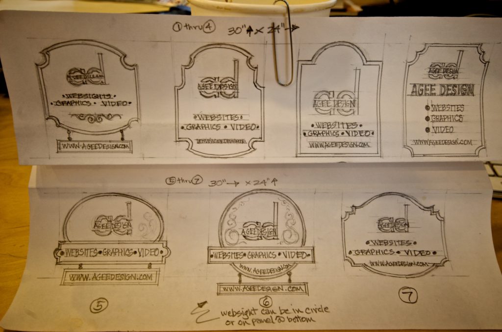 A local sign artist created a series of sketches for the sign which will hang in front of the new Agee Design headquarters. Which do you like best (1-7)?